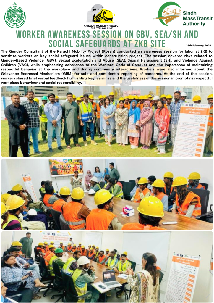 #KarachiMobilityProject #YellowLineBRT #WorkerAwareness #GBVPrevention #SafeWorkplace #SocialSafeguards #InfrastructureDevelopment